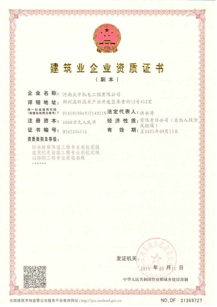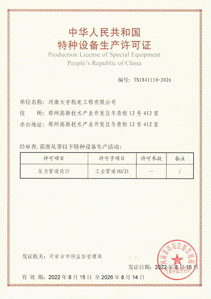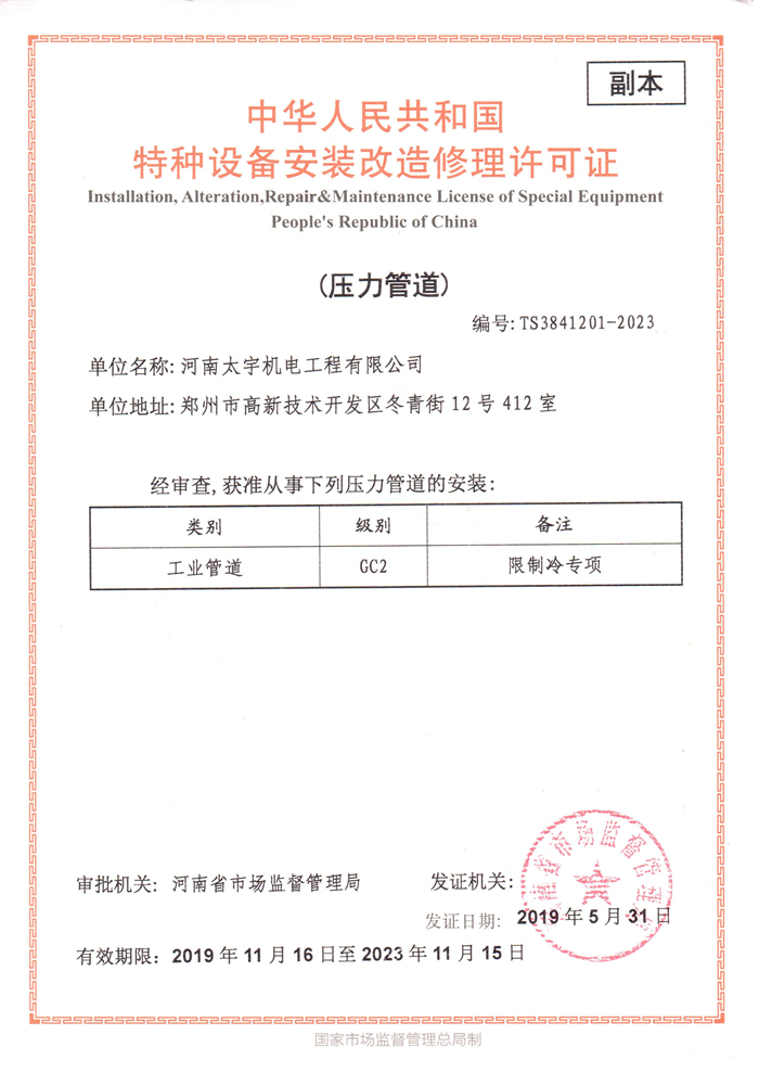 公司目前具有建筑機電安裝工程專(zhuān)業(yè)承包壹級、建筑工程施工總承包貳級、防水防腐保溫工程專(zhuān)業(yè)承包貳級、鋼結構工程專(zhuān)業(yè)承包貳級、建筑裝修裝飾工程專(zhuān)業(yè)承包貳級、特種工程(結構補強)專(zhuān)業(yè)承包不分等級、GC2壓力管道安裝改造維修資質(zhì)及設計資質(zhì),并通過(guò)了ISO9001質(zhì)量、環(huán)境、安全認證及高新技術(shù)企業(yè)認證,我們在不斷提升公司軟硬件實(shí)力的同時(shí),先后與河南牧業(yè)經(jīng)濟學(xué)院、河南農業(yè)大學(xué)等科研院所進(jìn)行了深入的交流與合作,與比澤爾、漢鐘、萊富康、艾默生、約克、丹佛斯、寶豐等國內外著(zhù)名企業(yè)建立了長(cháng)期穩定的合作關(guān)系。